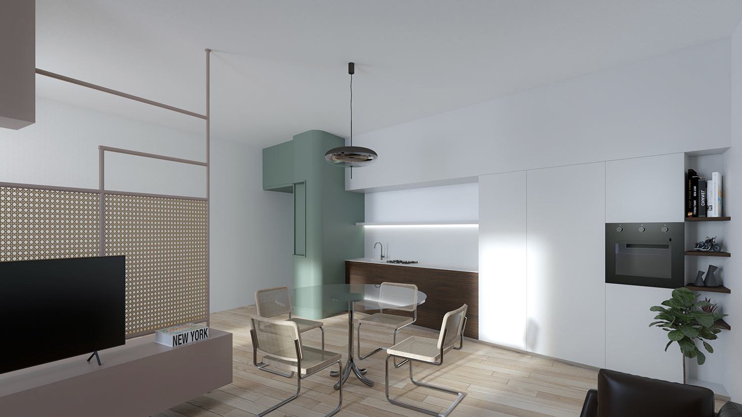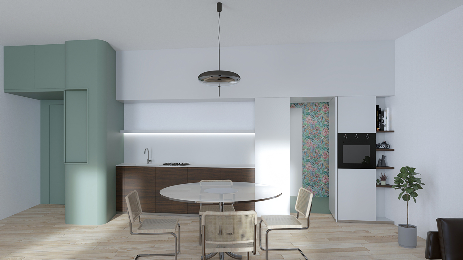 Una piccola zona ingresso attrezzata con un’armadiatura e caratterizzata dal colore verde salvia, si apre su un’ampia zona giorno.