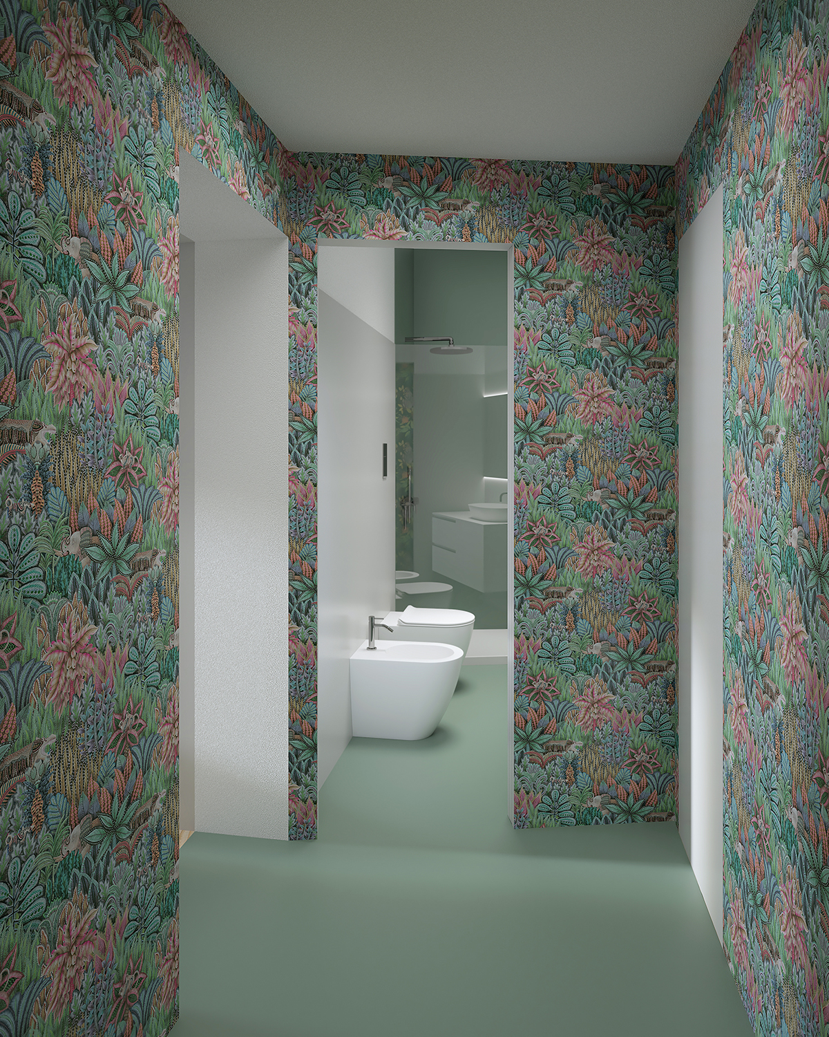 Cmoe l’ingresso, anche questa zona è caratterizzata cromaticamente dal verde salvia del pavimento in resina che prosegue anche in bagno e riveste anche la parete di fondo della doccia.